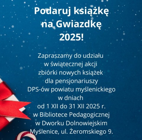 „Podaruj książkę na Gwiazdkę” to świąteczna akcja, która będzie trwać od 1 XII do 31 XII 2025 r. w Bibliotece Pedagogicznej w Myślenicach przy ulicy Żeromskiego 9 (Dworek Dolnowiejski).