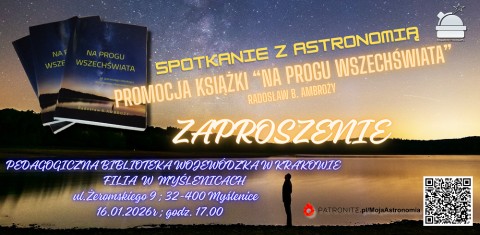 Spotkanie z Radosławem Ambrożym, autorem książki "Na progu Wszechświata"odbędzie się w Bibliotece Pedagogicznej w piątek 16 stycznia o godz. 17. Autor opowie dlaczego warto patrzeć w niebo, szczególnie w nocy.