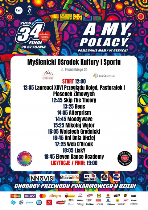 Wydarzenia w myślenickim sztabie mieszczącym się w Myślenickim Ośrodku Kultury i Sportu wystartują o godzinie 12:00, gdzie tuż po rozpoczęciu na finałową scenę wejdą Laureaci XXVI Przeglądu Kolęd, Pastorałek i Piosenek Zimowych