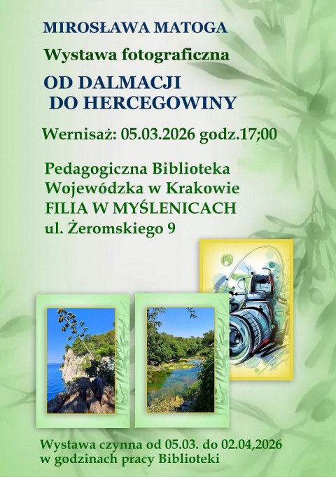 Otwarcie wystawy fotografii Mirosławy Matogi OD DALMACJI DO HERCEGOWINY odbędzie się 5 marca 2026 r. o godz. 17.00 w czytelni naszej Biblioteki Pedagogicznej. Spotkanie wzbogaci prelekcja autorki połączona z pokazem slajdów "Opowieści znad Neretwy".