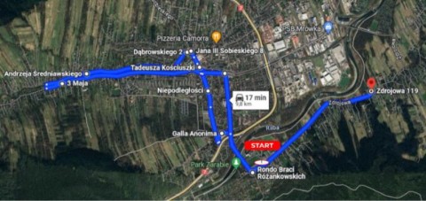 20 samochodów przejedzie ulicami: start z parkingu na Zarabiu, przy rondzie Braci Różańkowskich, ul. J. Piłsudskiego, ul . Galla Anonima, ul. Ignacego Daszyńskiego, ul. Niepodległości, ul. T. Kościuszki, Rynek Myślenice, J. Sobieskiego, ul. Dąbrowskiego, ul. K. Kniaziewicza, A. Średniawskiego, ul. 3-go Maja, ul. Księcia Józefa Poniatowskiego, Słowackiego, ul. J. Piłsudskiego – MOKIS i zakończenie na ul. Zdrojowej 119.
